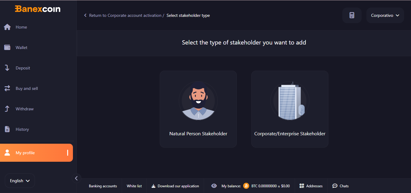 To obtain the Corporate client level increase on the platform, it is necessary to register your Banexcoin account as a legal entity and comply with certain requirements. requirements.