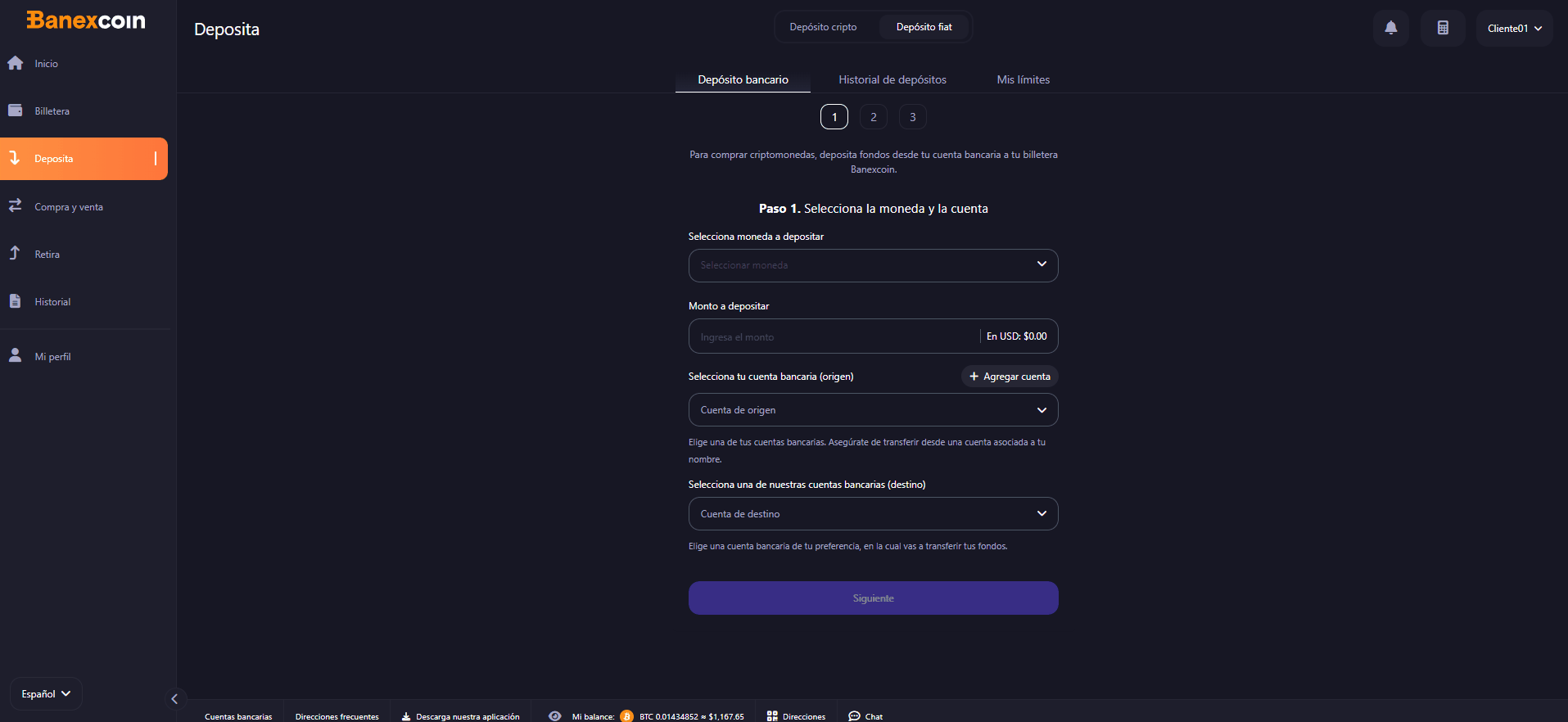 - Dirígete a Deposita, en la parte izquierda de la página, haz clic en depósito fiat en la parte superior de la pantalla, seleccionar el tipo de moneda que desea utilizar dólares (USD), luego debes de ingresar el monto a depositar, elegir tu cuenta bancaria de origen (la cual debes haber agregado previamente) y luego selecciona la cuenta bancaria de destino.